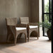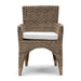 Esszimmerstuhl, hergestellt aus Rustic Rattan. An der Rückseite der Sitzlehne ist ein brauner Ledergriff angebracht. Rustic Rattan ist ein Naturprodukt, das in einem natürlichen Verfahren gefärbt wird. Dadurch ist jedes Produkt einzigartig. Auch aus weißem Pitrit erhältlich.