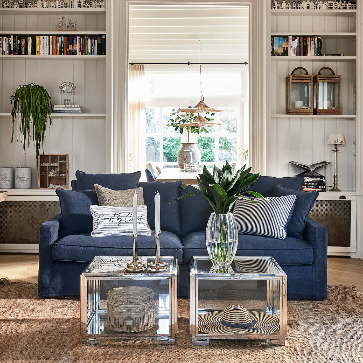 Das Lennox Sofa lädt mit seinen großen Sofakissen direkt zum Verweilen ein. Durch das Glas der Les Puces Couchtische wirkt der Raum sehr offen und luftig.