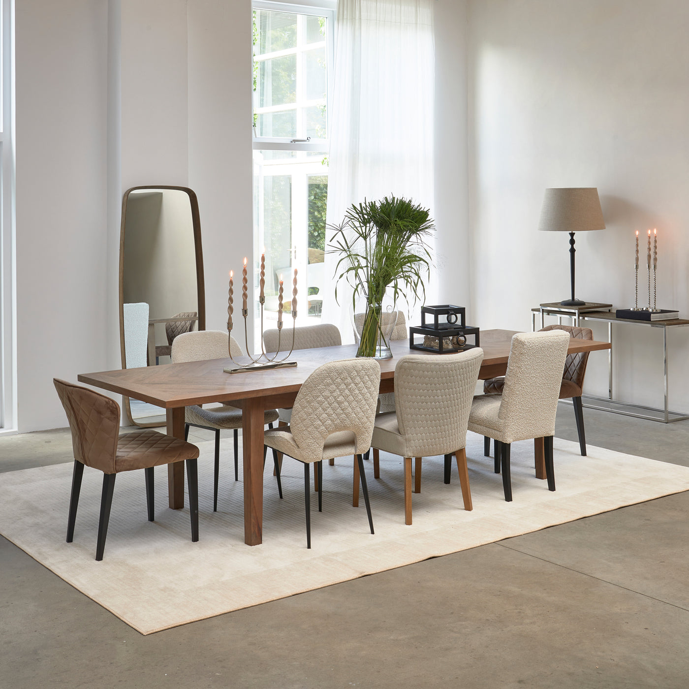 Ein optisch zurückhaltender Holztisch gepaart mit einer Auswahl an modernen Esszimmerstühlen funktionieren. Der Bodie Hill Esstisch haucht dem Raum die nötige Wärme und Gemütlichkeit ein. Durch die Stühle ist das Gesamtbild dennoch modern und minimalistisch.