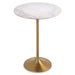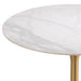 Seine runde Keramik-Tischplatte in Marmoroptik wird von einer Säule in gebürsteter Messingoptik getragen, die sich nach unten hin wie ein Trompetentrichter auffächert.